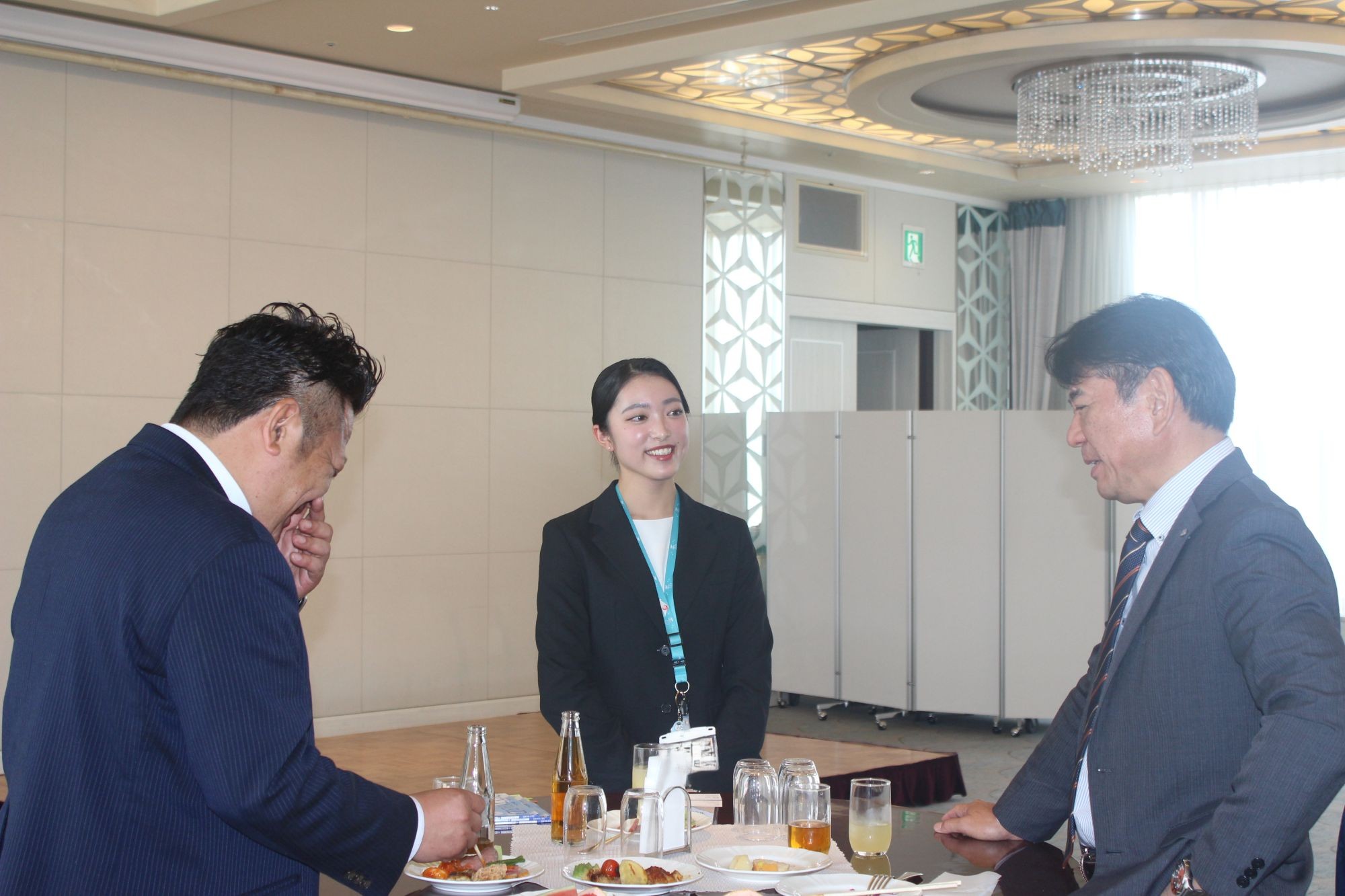 (モックアップ落成式後の懇親会で、日本航空の方と談笑中の井上さん)