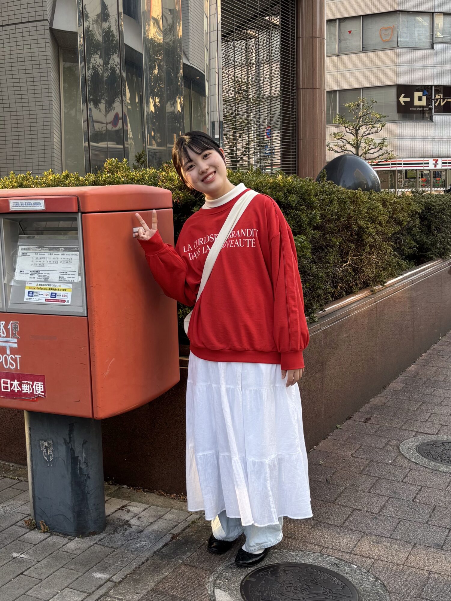 (アダストリアのエントリーに添付した友金さんの全身写真 赤がコーデのポイントということで、ポストと一緒に)