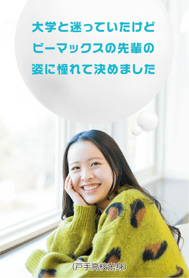 ビーマックスでは当たり前の挨拶や傾聴は、社会に出てみると意外と当たり前ではなく、先輩からお褒めの言葉を頂いたり、お客様にも良い印象を持って頂けたりします。社会人としての基礎を、学校生活の中で学ぶことができていたのだと、今改めて感じています。