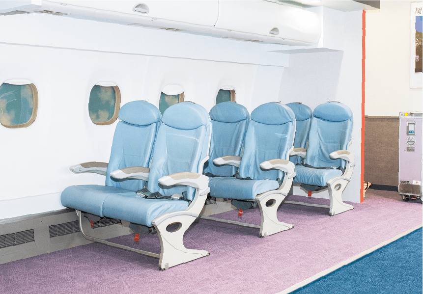 実際に使用されていた旅客機の座席を使って機内サービスやアナウンスなど、より実際の現場に近い状況で学べます。また、ウォーキングルームもあり、エアライン業界にかかすことのできない立ち居振る舞いについても習得することができます。